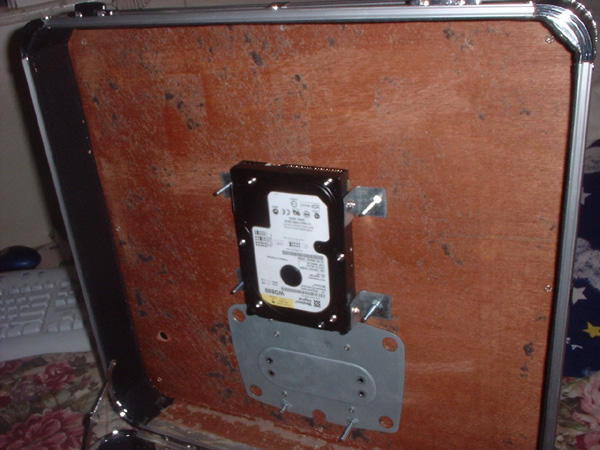 Now I have my HD mounted right about the plate, it's all coming together. At this point I paused to cut some huge holes into my case.