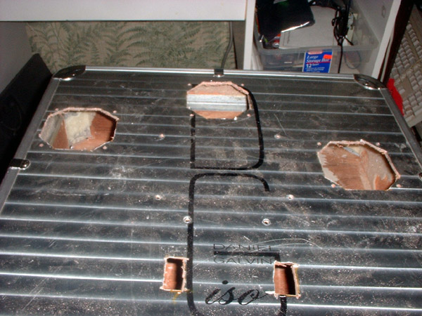 Some better holes here. Cut out three holes for three fans with my jigsaw. Not perfect, but it was definitely a rush job.