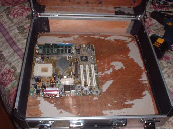 No surprises here, simply bolted the mobo in, CPU up against the side with just enough room for the fan, and held it up away from the bottom of the case on two nuts.