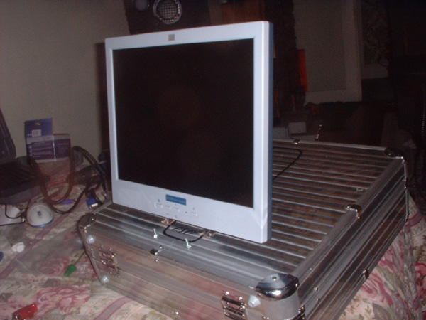 And this is the monitor mounted to the plate, you can see how my design has changed drastically, now the monitor is mounted on the outside and folds down during transport.