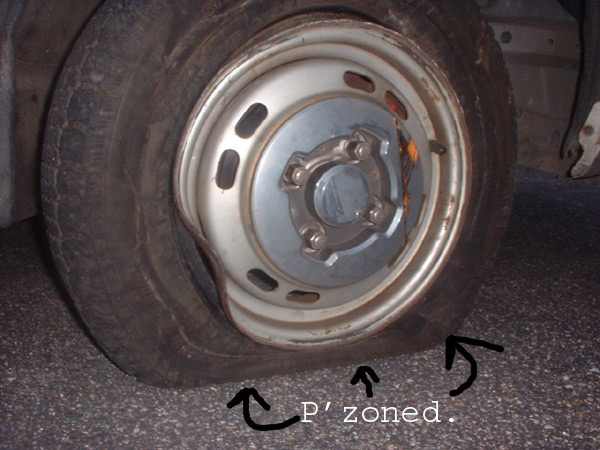 So I'm busy building my case, I'm almost done. Then I realise: "Hey, I'm out of washers!" So I run down to Home Depot to buy some. Now, I had been up all the night the night before watching movies with my friends, so I was understandably tired. As I drove into the parking lot, I hit one of those large orange flatbed carts with my car. It completely destroyed my tire, as you can see here.